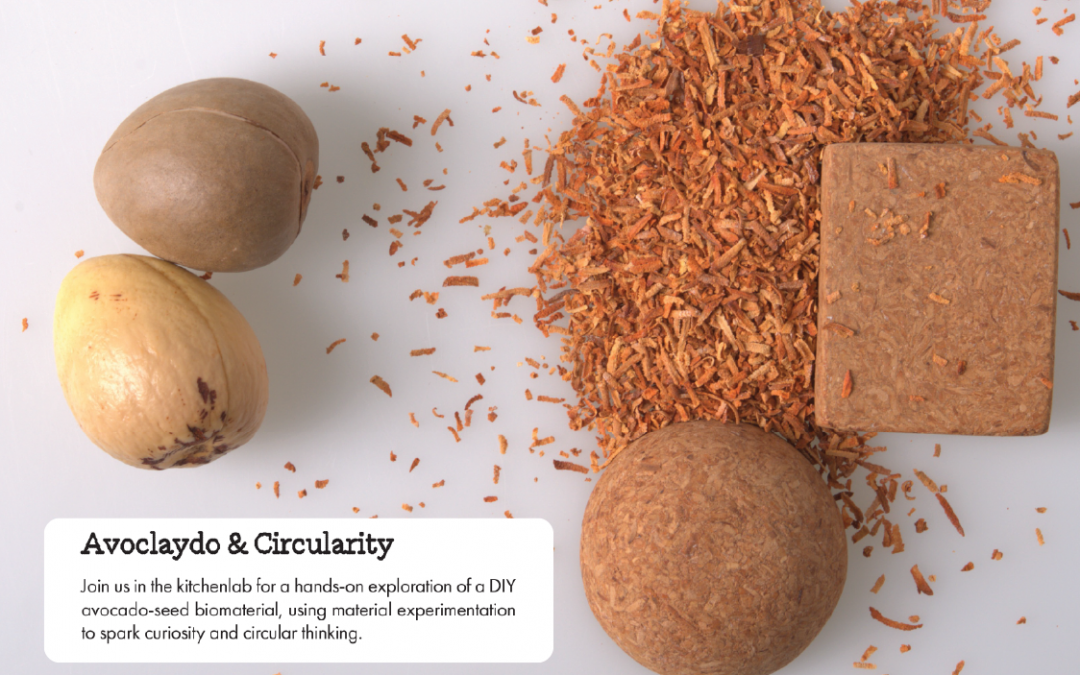 Avoclaydo & Circularity takes place in the kitchen lab, where participants cook and experiment with a biomaterial starting from the avocado seed. Together, we learn a shared recipe and explore circular design principles through material-driven practice.